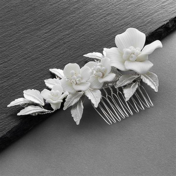 This silver bridal hair clip has clusters of light ivory resin flowers, soft white beads, and crystals hand-wired to a silver-plated metal comb.
